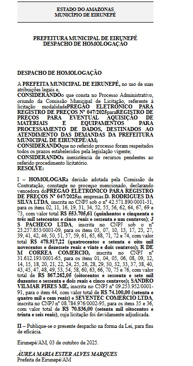 A prefeita de Eirunepé (AM), Áurea Marques (MDB), autorizou contratos que somam mais de R$ 2 milhões com cinco empresas, sem detalhar quais produtos serão adquiridos, segundo publicação no Diário Oficial dos Municípios (DOM). De acordo com a gestão, as compras têm como objetivo atender às necessidades da prefeitura.