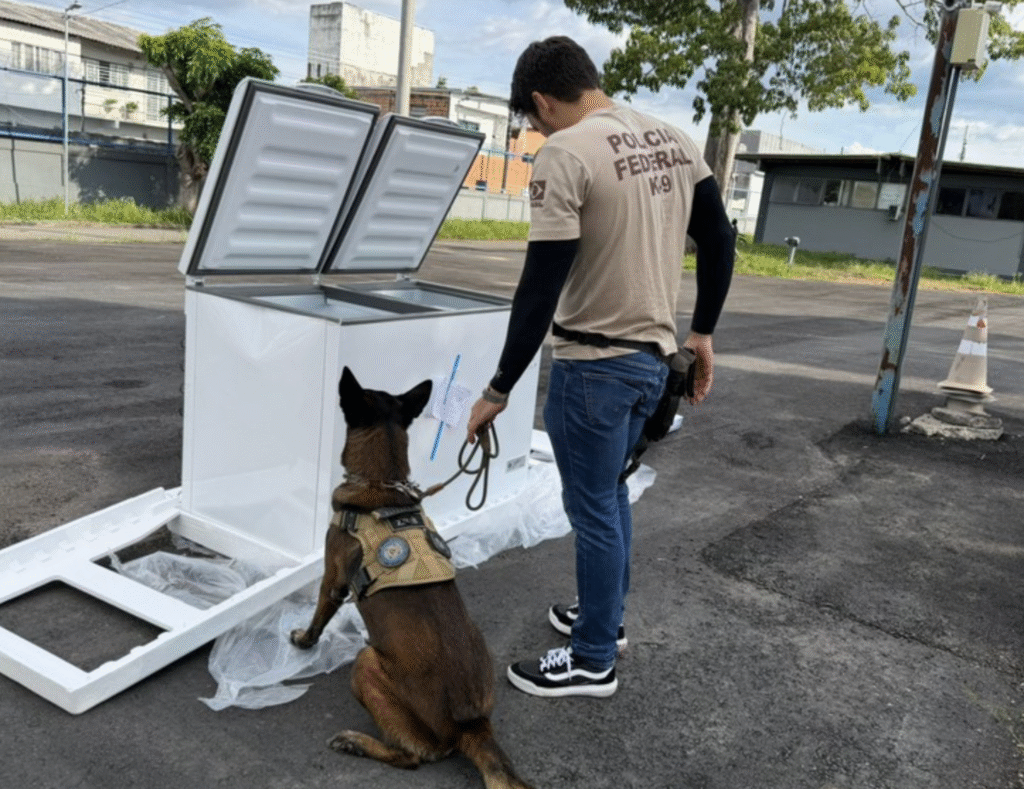 Com o apoio de um cão farejador, os policiais localizaram tabletes de drogas ocultos nas paredes internas dos freezers que estavam acondicionados no baú do veículo. Além dos entorpecentes, foram apreendidas duas pistolas calibre 9 mm com numeração raspada, além de carregadores e munições do mesmo calibre.