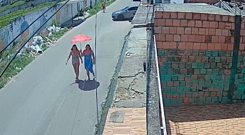 Nas imagens, é possível ver as duas caminhando pela rua quando um carro modelo Ônix se aproxima. O suspeito desce do veículo e, segurando uma faca, ameaça a mulher e exige que ela entregue o celular. Após pegar o aparelho, ele volta para o carro e foge rapidamente.