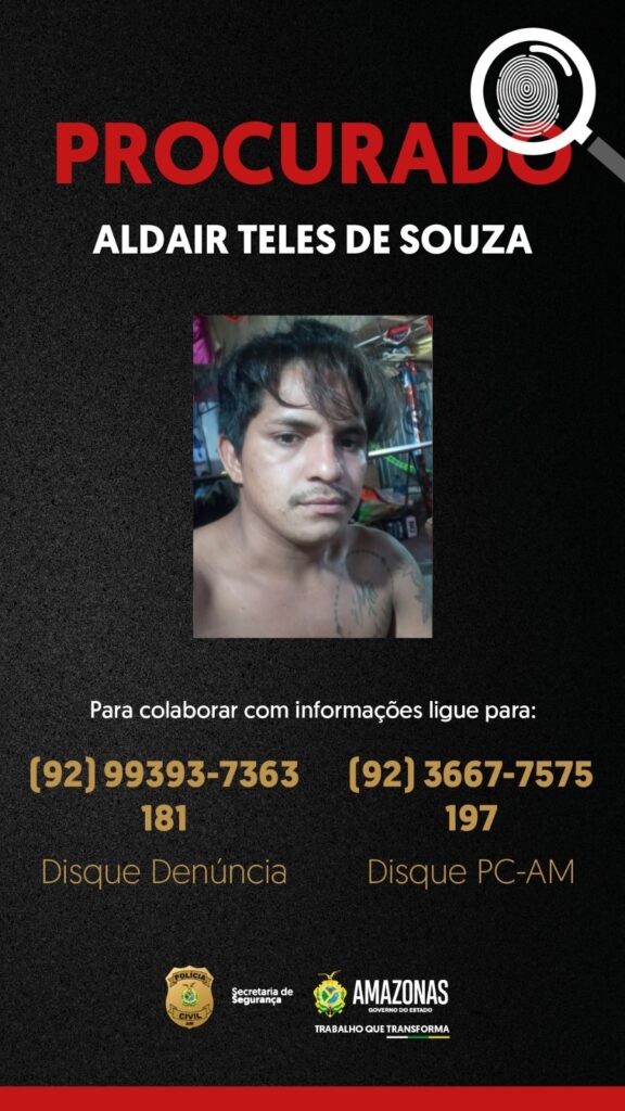 A Polícia Civil do Amazonas (PC-AM) divulgou a imagem de Aldair Teles de Souza, de 27 anos, que está sendo procurado por tentativa de feminicídio contra a ex-companheira, de 37 anos. O crime ocorreu no dia 21 de janeiro, em Manacapuru, a 68 quilômetros de Manaus.