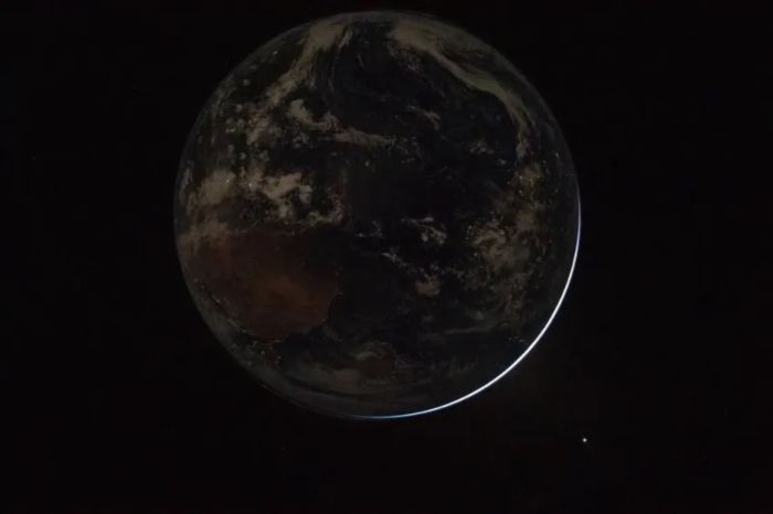 Em uma terceira foto da tripulação da Artemis II, a linha divisória entre a noite e o dia, conhecida como terminador, é vista atravessando a Terra. Na quarta, vemos luzes elétricas da atividade humana. No canto inferior direito, a luz do sol ilumina a borda do planeta.